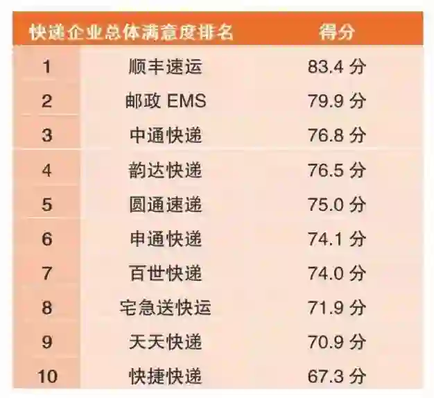 测试结果显示,快递企业总体满意度排名和得分依次为:顺丰速运(83.4分)、邮政EMS(79.9分)、中通快递(76.8分)、韵达快递(76.5分)、圆通速递(75.0分)、申通快递(74.1分)、百世快递(74.0分)、宅急送快运(71.9分)、天天快递(70.9分)和快捷快递(67.3分)。其中,韵达快递和百世快递总体满意度上升较为明显。