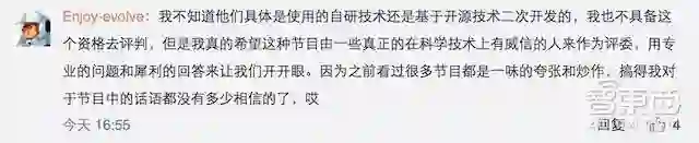 前者比如@acryl小兔小兔:“这个节目确实不错,让我这个科技盲知道了很多事”,@MIYA快跑才能行15:“真的是好厉害的样子呀,哈哈。”