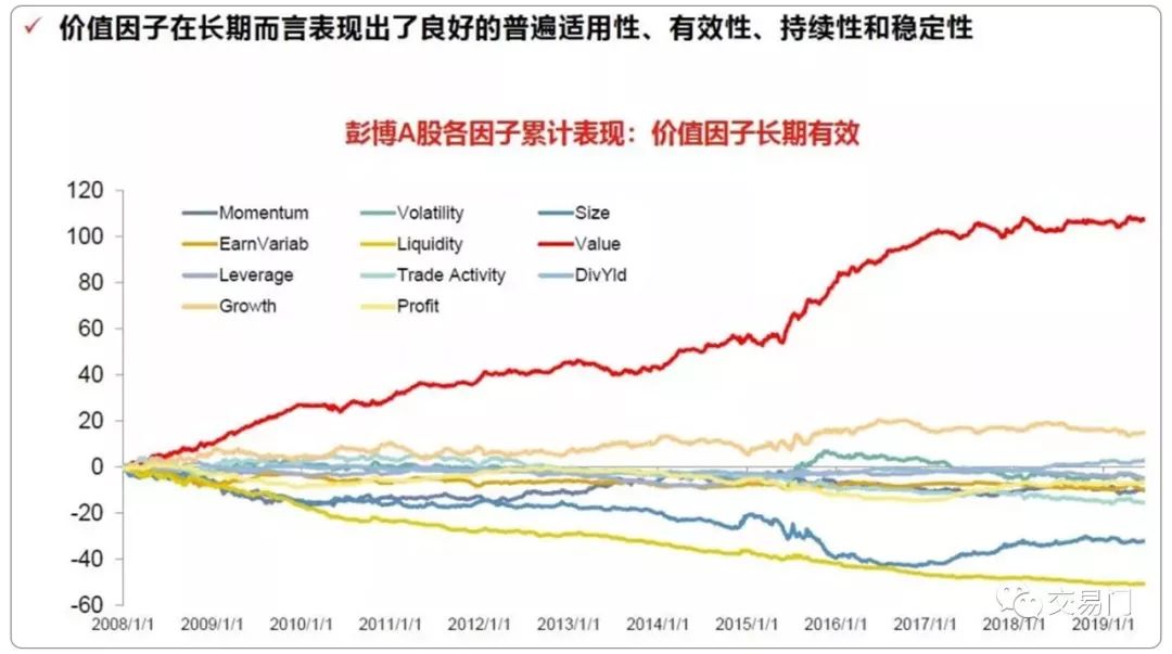 下面这张图显示了从2008年到2019年6月18日,A股各因子的累计表现。红色线表示的是价值因子(Value),显示了很强的收益率,这个收益率主要来自做多低估值股票,做空高估值股票。我们看到价值因子的收益率非常稳定,从2008年至今获得了100%的收益,而且回撤很小。从相对收益的角度看,这个收益率曲线体现了低估值股票在过去10年远远跑赢高估值股票,有很强的相对收益。