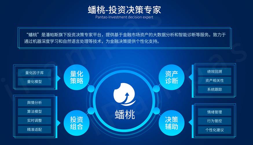 “蟠桃”定位为投资决策专家,面向B端客户提供投资决策服务。潘帕斯对覆盖全球的各类资产进行更多维度的资产分析,不仅包括公开的市场数据,还包括舆情分析、理财师和基金经理的情绪管理和行为管控,以及资产相关性等。通过机器深度学习和自然语言处理等技术,基于自身算法模型和特色量化因子库,为B端客户的金融决策提供个性化支持。