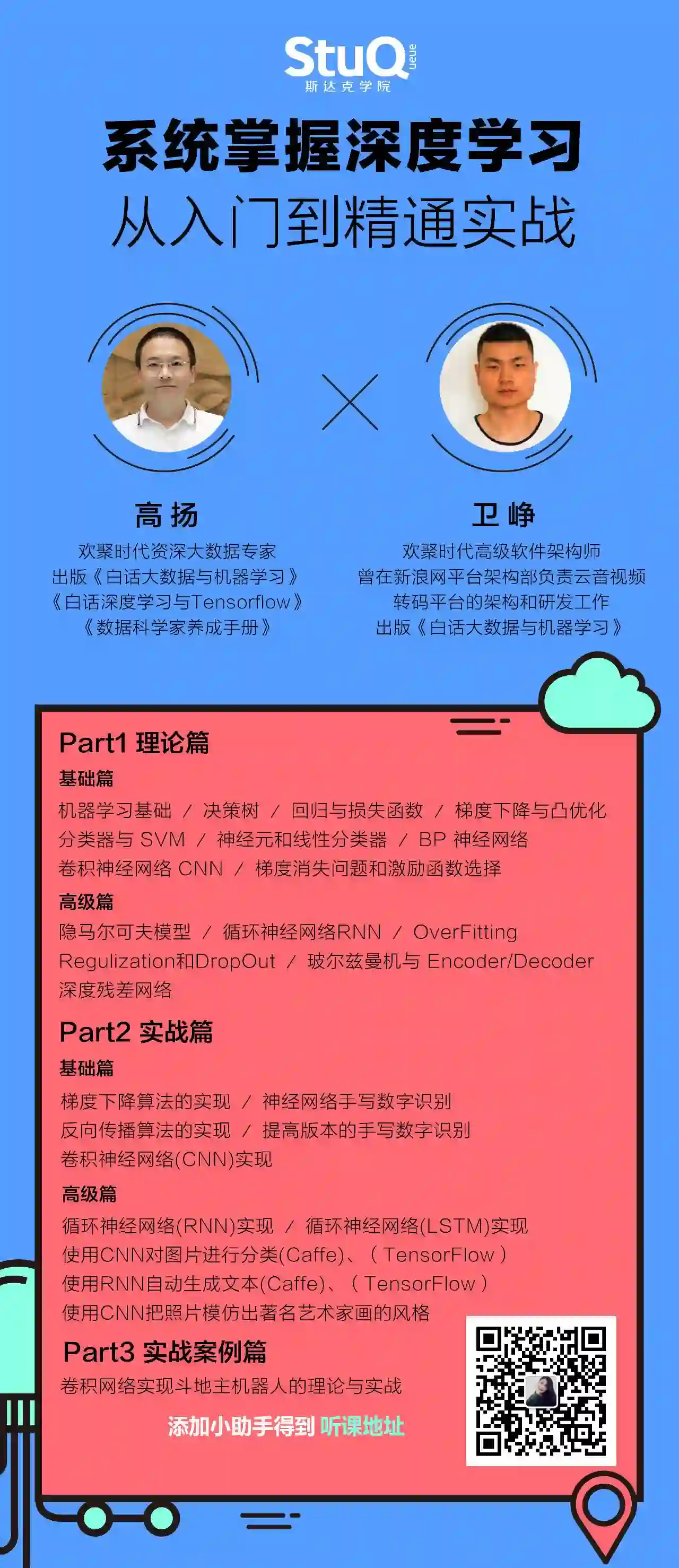 斯达克学院(StuQ)特邀请《白话大数据与机器学习》、《白话深度学习与 TensorFlow》作者高扬 老师担任课程出品人,共同推出了《深度学习从入门到精通实战》课程,通过由浅入深的理论知识讲解和实操代码实现人工智能经典实战案例,帮助学员降低学习门槛,更高效掌握深度学习核心技能。