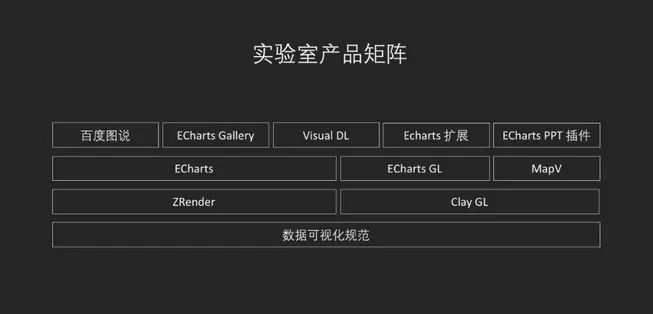 百度数据可视化实验室的产品矩阵如下图所示,内容涵盖基础库、各种可视化产品以及应用产品。