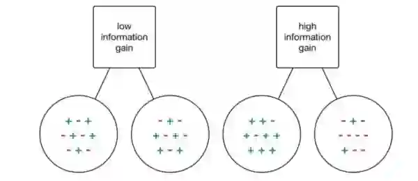 如果我们要选择一个拆分,其中每个输出都有一个依赖于数据的类组合,那么,我们实际上根本没有获得任何信息;我们不知道是否存在这样的一个特定节点(即特征),对我们的数据分类有任何影响!另一方面,如果我们的拆分对于每个输出的每个类都有很高的百分比,那么我们就会得到这样的信息,即在特定的特征变量上以特定的方式对信息进行拆分,会得到一个特定的输出!