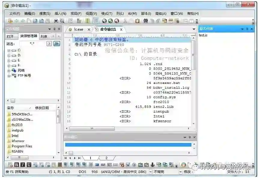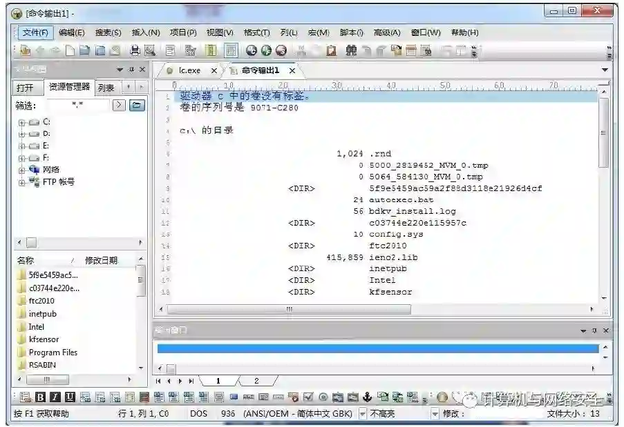 步骤11:在“命令”文本框中输入Dos命令,如dir、ping等,单击“确定”按钮,即可在UltraEdit主窗口的编辑区中看到该命令的具体执行结果。利用这项功能可以截取Dos窗口运行的文本信息,如图10所示。
