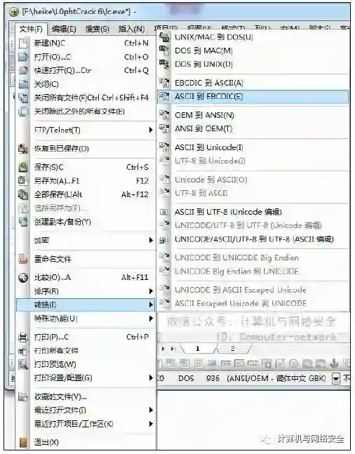 步骤08:如果在UltraEdit主窗口中选择“文件”→“转换”菜单项,则可展开UltraEdit的文本格式转换菜单,在其中进行UNIX/MAC与DOS、EBCDIC与ASCII、OEM与ANSI之间文本的相互转换,如图7所示。