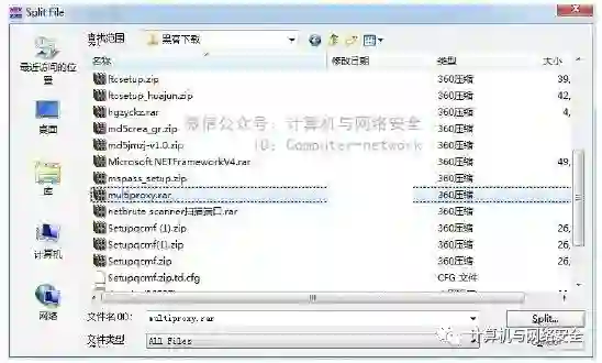 步骤13:在WinHex软件中还可以将应用程序分割为指定大小的文件。在WinHex主窗口中选择Tools(工具)→Files Tools(文件工具)→Split(分割)菜单项,即可打开Split File(分割文件)对话框,在其中选择需要分割的文件,如图38所示。