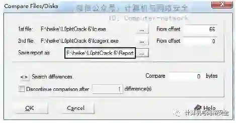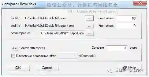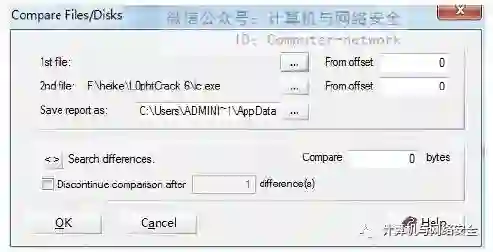 步骤07:利用WinHex软件还可以对文件进行连接、分割、合并、不可逆转删除和比较等操作。在解密时经常用到的功能是比较,即通过比较解密前后的文件看出解密者对程序中的哪些代码做了修改,最后生成一个文本方式差别报告。在WinHex主窗口中选择Tools(工具)→Files Tools(文件工具)→Compare(比较)菜单项,即可打开Compare File/Disks(比较文件/硬盘)对话框,如图31所示。