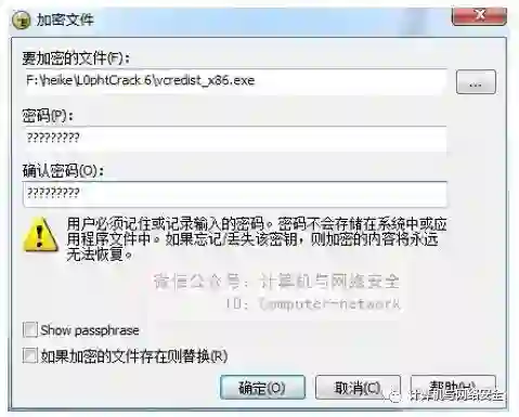步骤19:利用UltraEdit软件还可以对应用程序进行加密和解密操作。在UltraEdit主窗口中选择“文件”→“加密”→“加密文件”菜单项,即可打开“加密文件”对话框,在“密码”和“确认密码”文本框中分别输入要设置的密码,如图1-18所示。