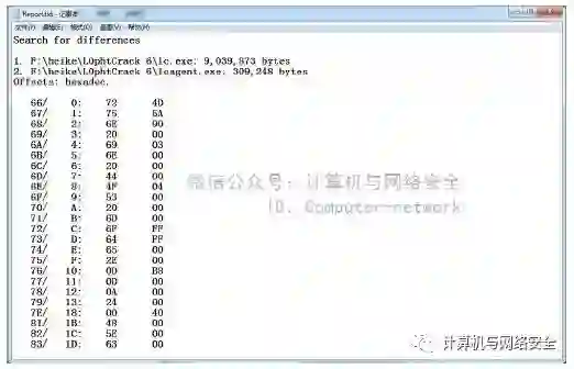 步骤12:当系统完成文件的比较之后,将会产生一个文本文件,从中可以看到不同代码处的偏移地址、代码内容和差别总数等信息,如图37所示。