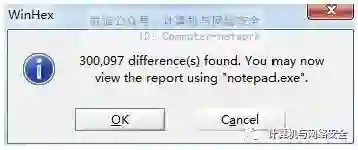 步骤11:单击“保存”按钮,即可返回到比较文件/硬盘对话框,在其中可看到报告的具体保存位置,如图35所示。单击OK按钮,即可打开可以用记事本程序查看报告【提示】框,如图36所示。