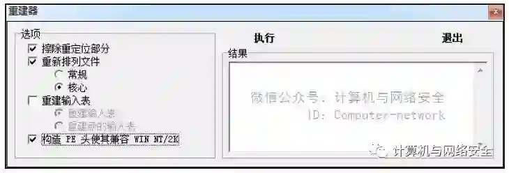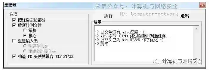 步骤10:在PEditor 1.7主窗口中单击“重建程序”按钮,即可打开“重建器”对话框,在其中勾选相应的复选框,如图53所示。单击“执行”按钮,即可重建打开的应用程序,如图54所示。