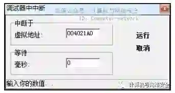 步骤05:在PEditor 1.7主窗口中单击“调试器中中断”按钮,即可打开“调试器中中断”对话框,在“虚拟地址”文本框中输入虚拟地址,如图47所示。