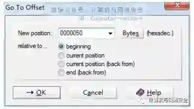 步骤03:在WinHex可以定位到某个偏移地址处,在WinHex主窗口中选择Navigation(浏览)→Go To Offset(转到偏移量)菜单项,即可打开Go To Offset对话框,在New position(新位置)文本框中输入0000050,如图27所示。