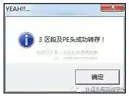 步骤04:在PEditor 1.7主窗口中单击“分割节”按钮,即可打开“3区段及PE头成功转存”【提示】框,如图46所示。单击“确定”按钮,即可转存3区段和PE头文件。