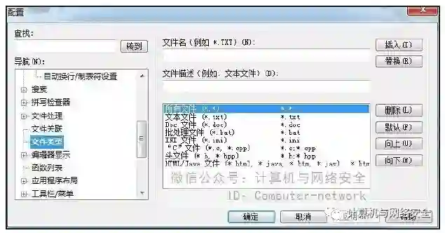步骤07:还可以让UltraEdit软件打开指定类型的文件,其具体的添加方法为,在UltraEdit主窗口中选择“高级”→“配置”菜单项,即可打开“配置”对话框。在“文件类型”选项卡下就可以添加新的文件类型,如图6所示。