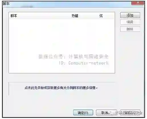 步骤15:如果想在UltraEdit工具中插入并使用已经存在的脚本文件,则在UltraEdit主窗口中选择“脚本”→“脚本”菜单项,即可打开“脚本”对话框。在其中可进行添加、编辑、删除脚本操作,如图14所示。