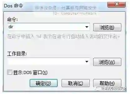 步骤10:在UltraEdit软件中还可以直接调用DOS和Windows命令。在UltraEdit主窗口中选择“高级”→“DOS命令”菜单项或按F9键,即可打开“Dos命令”对话框,如图9所示。