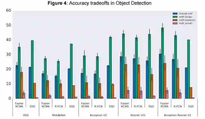 Note: Y-axis displays mAP (mean Average Precision) and the X-axis displays meta-architecture variability across each feature extractor (VGG, MobileNet...Inception ResNet V2). Additionally, mAP small, medium and large describe the average precision for small, medium and large objects, respectively. As such accuracy is “stratified by object size, meta-architecture and feature extractor” and “image resolution is fixed to 300”. While Faster R-CNN performs comparatively well in the above sample, it is worth noting that the meta-architecture is considerably slower than more recent approaches, such as R-FCN.