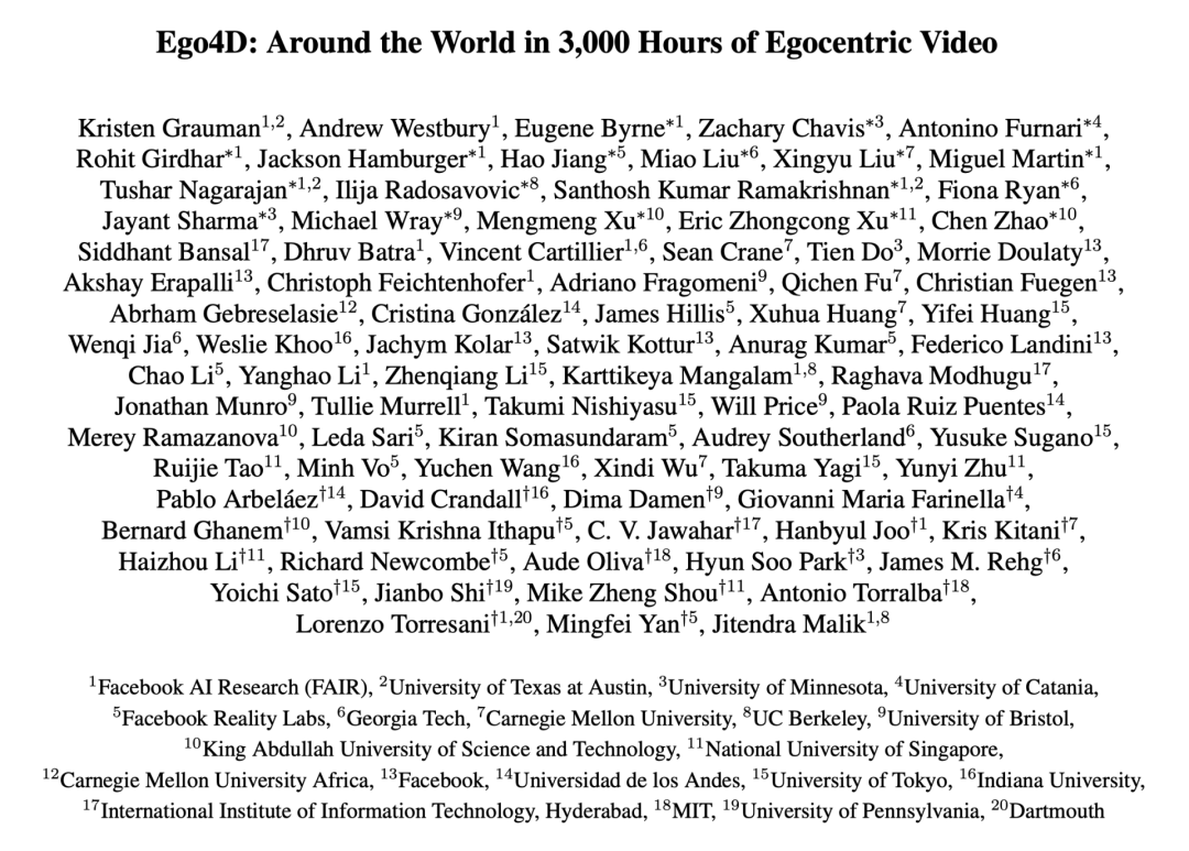 Facebook和NUS、MIT等高校联合推出3000小时的第一视角视频数据集Ego4D