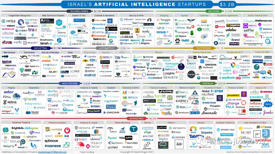 1. 对以色列AI创业公司的投资正在升温。 2017年至今,以色列AI创业公司已经筹集了8.37亿美元,超过2016年总额,比去年同期增长了十五倍。