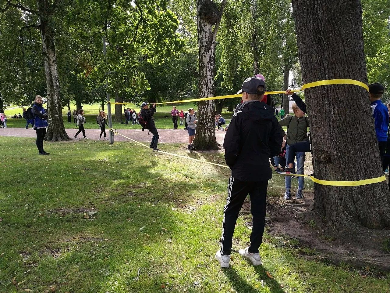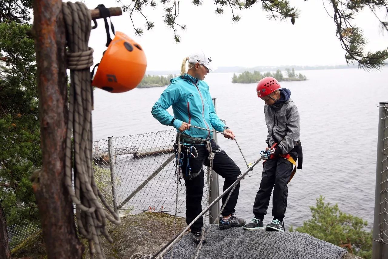 ▲三年级的孩子在老师的指导下,感受岩体垂降