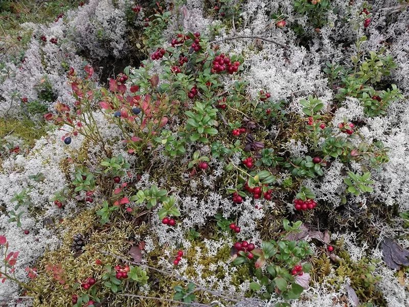 ▲丰富的苔藓与浆果交织成五彩斑斓的郊野地毯。白色苔藓是驯鹿冬季的生命食材,其根系十分脆弱。芬兰人从不会踩踏此类植被