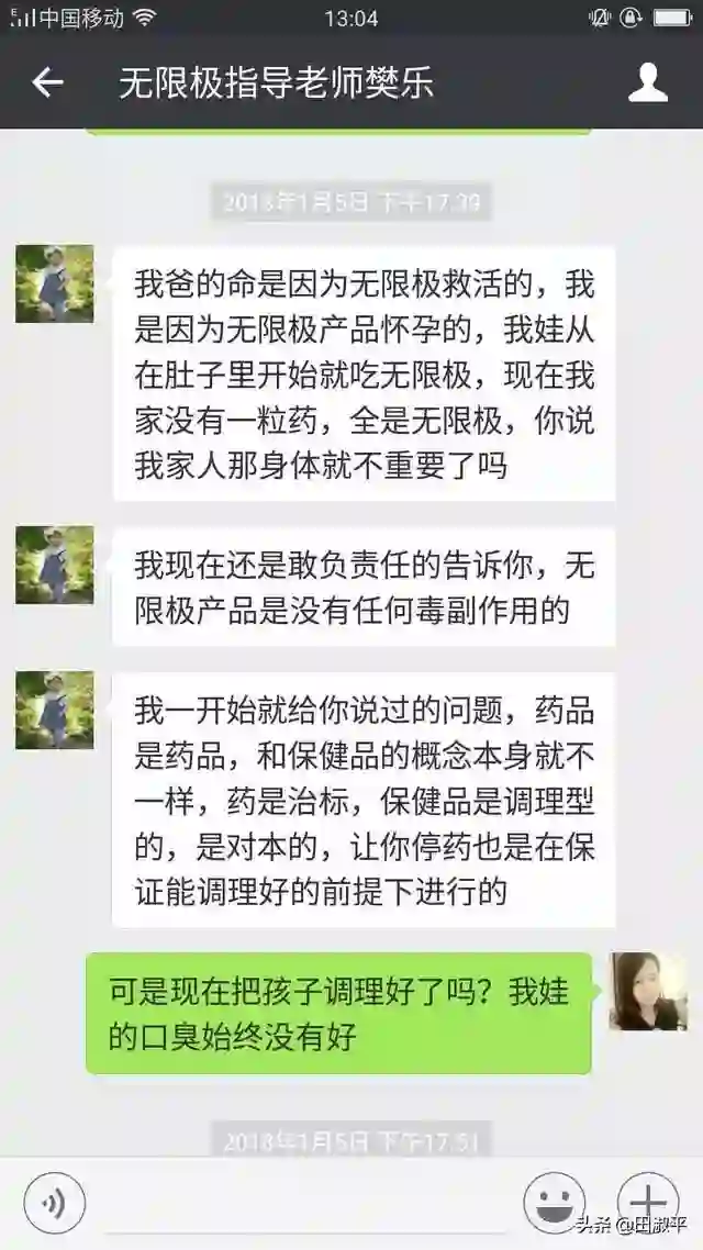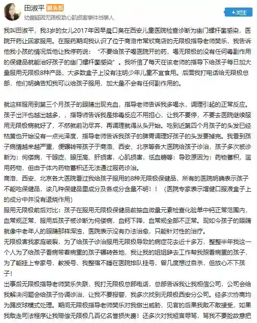 1月16日下午,一位在今日头条认证为“幼童疑因无限极致心肌损害事件当事人田淑平”的网友曝出,其3岁女儿被诊断为“幽门螺杆菌感染”后,在陕西当地一位“无限极指导老师樊乐”推荐下,每日大量服用无限极8种产品,后被多家医院诊断为心肌损害、低血糖等病症。