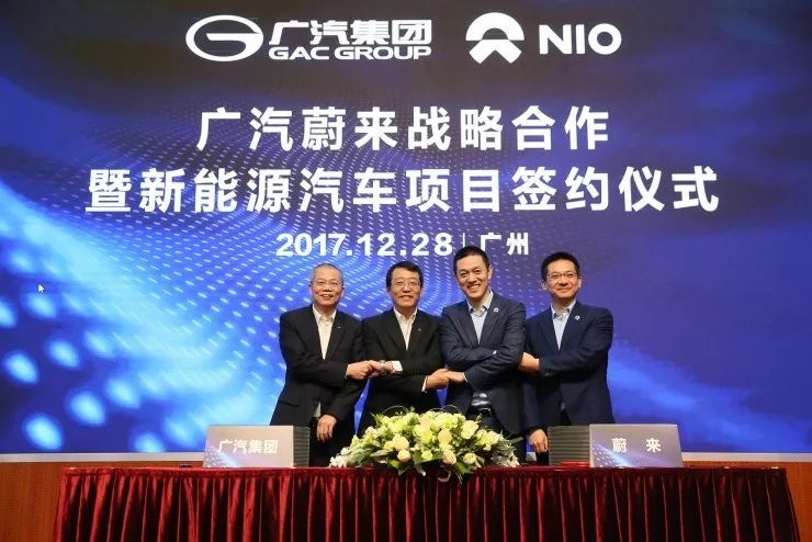 北京时间 12 月 28 日,广汽与蔚来在广州举行战略合作暨新能源汽车项目签约仪式,双方共同出资设立广汽蔚来新能源汽车有限公司。合创公司规划总投资 12.8 亿元,注册资本 5 亿元,其中广汽、蔚来占比分别为 45% 和 45%,另外 10% 股份将用于激励合创公司核心团队,暂时由蔚来代持。
