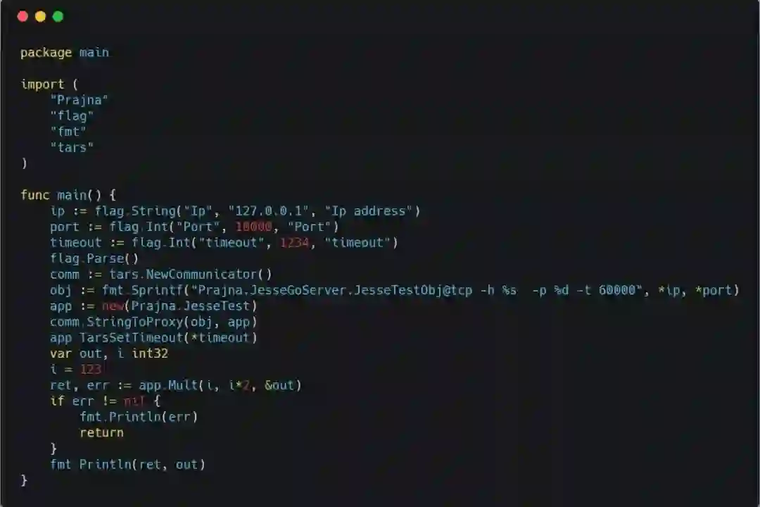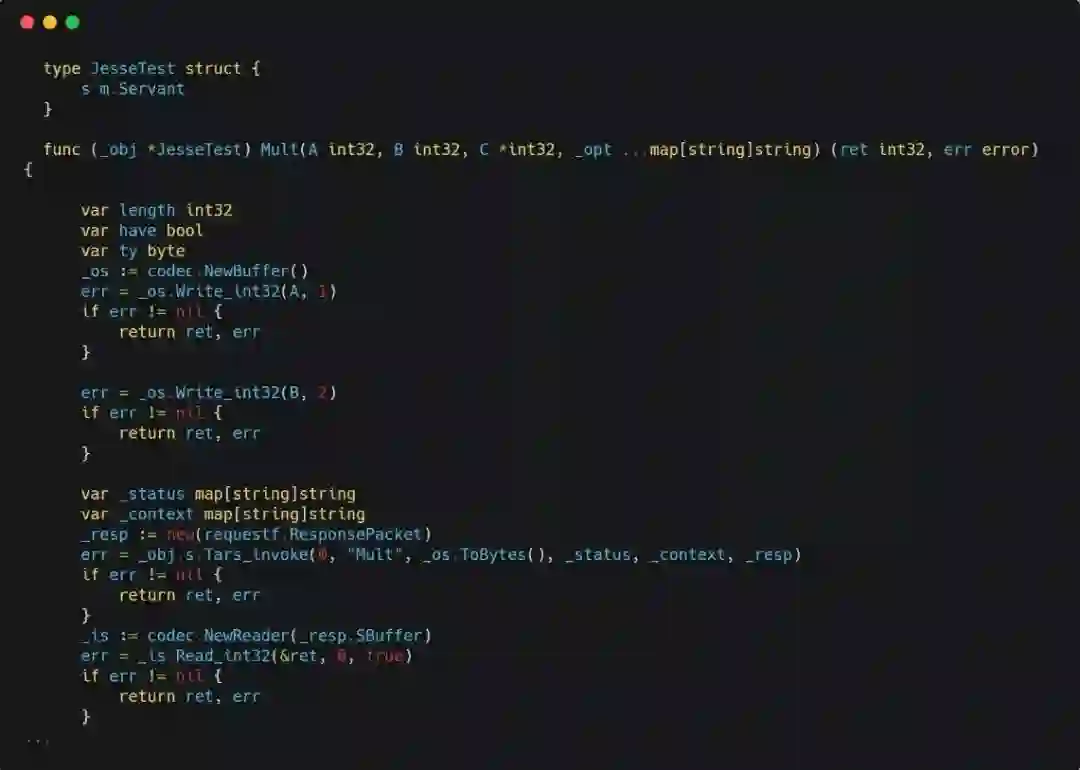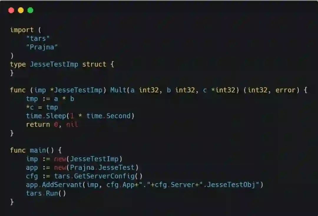 接着生成接口代码。使用 tars2go JesseTest.tars 即可自动生成 pacakge Prajna JesseTest 的 servant 和 Mult 方法的框架实现,业务无需关心实现细节: