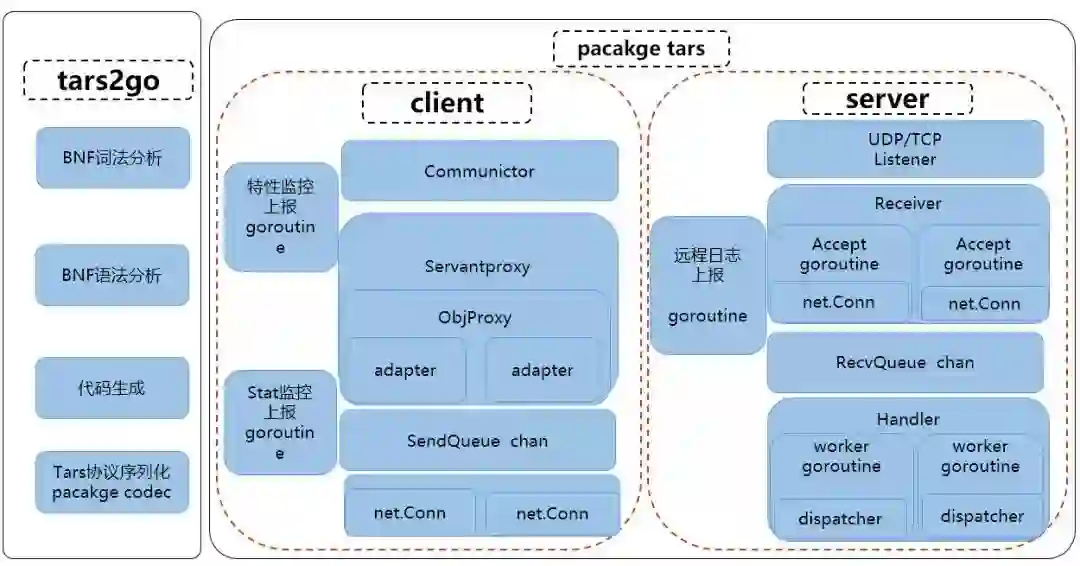 此次新推出的 Go 版本 Tars-Go 整体架构主要可以分为三个部分,如下图所示: