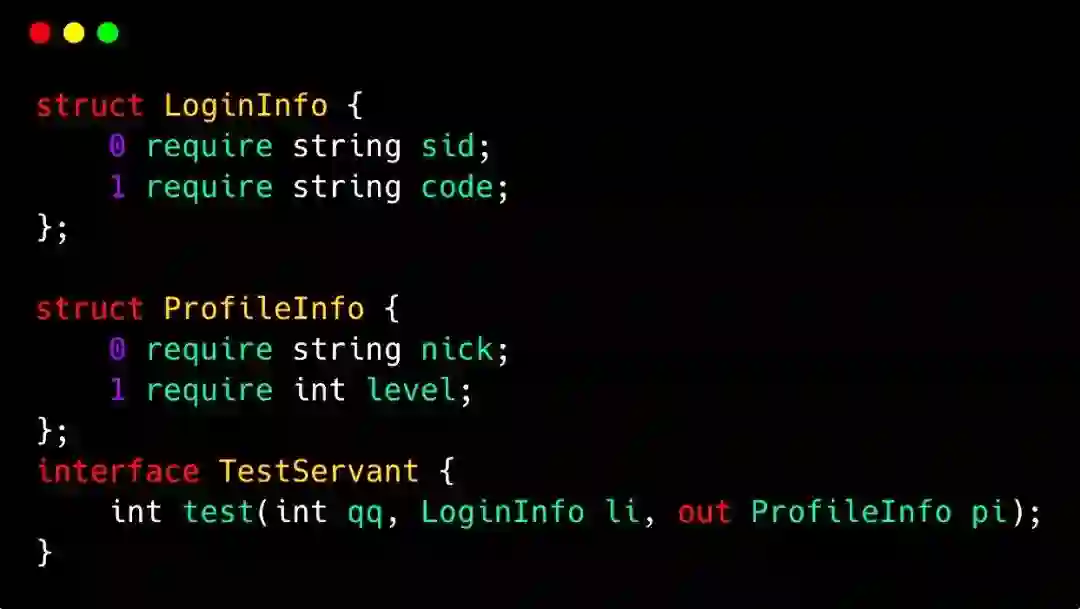 Tars 协议是一个二进制协议,它是与语言无关的IDL语言,由工具自动生成服务端和客户端代码,下边是一个 Tars 协议的示例:
