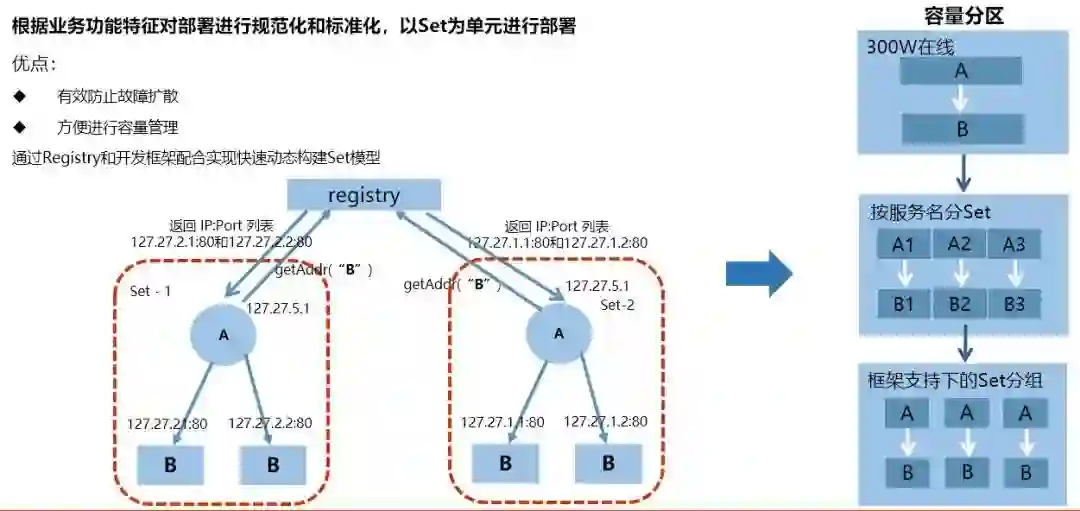 Set 模型是根据业务功能特征对部署进行规范化和标准化,以 Set 为单元进行部署。Set 模型的优点有: