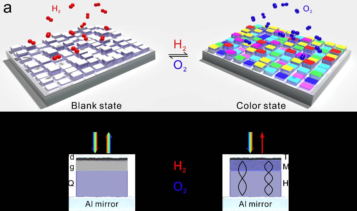 为了提高结构色的纯度并扩展其色域,2016年,湖南大学段辉高课题组提出了一种新方案。他们基于纳米精度的灰度台阶加工,在金属铝(Al)镜上实现像素化的多厚度法布里-帕罗共振腔(FP腔),利用不同介质厚度FP腔选择性消光的物理原理,实现了广色域、高纯度的高分辨全彩打印,同时将梵高著名的《向日葵》作品微缩至头发丝大小的尺度并能清晰地重现。在此方案的基础上,近日,段辉高课题组与德国马普智能系统研究所Na Liu课题组展开国际合作,将智能金镁/钛/钯智能金属层沉积在多台阶的FP腔表面,实现了基于结构色的可动态调控彩色显示器件。器件的工作原理如图1所示:在未氢化的情况下,由于沉积的金属镁将入射的可见光全反射回去,故整个画面呈现为白色。当器件置于氢气氛围时,在金属钯的催化下,氢分子变成氢原子,并与金属镁结合发生氢化反应形成透明的氢化镁(MgH2)介质,进而金属镁由全反射态转变成透明的MgH2介质态,形成对特定波长吸收的FP腔,从而实现颜色的效果。同时,颜色也可以通过引入O2而逐渐褪去,这是因为介质MgH2遇到O2发生脱氢反应又变回金属Mg状态,画面回到全白状态。