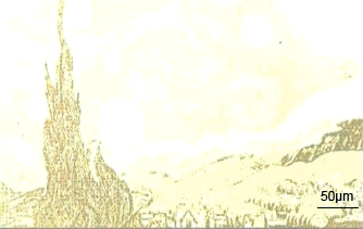 基于上述的彩色打印原理,实现了梵高著名的《星空》时间演绎,如图2所示,整幅画面的横向尺寸为500微米。在未通入H2时,这个画面主要以黑白色调描绘的近处的树木及远处的山脉、房屋,天空一片空白。当有H2引入,整个画面逐渐开始出现颜色,天空逐渐变成蓝色,旋转的云彩及月亮逐渐显现,随着H2通入时间的延续,整幅画面的颜色纯度逐渐提高,直至达到饱和不再发生变化。在逆过程中通入O2,整幅星空又逐渐恢复到黑白色调的素描画面。作为一种全新的显色概念,该技术在动态显色元件、智能汽车玻璃、高端信息加密与防伪等领域具有应用前景。