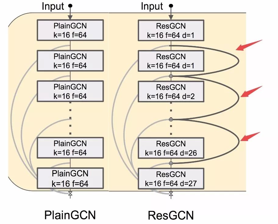 在通常 GCN 的基础上,研究人员为每一层增加了残差链接,这些链接将为信息和梯度的传输提供了额外的连接通道,将有效解决梯度消失的问题。