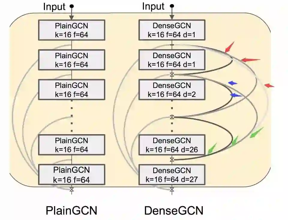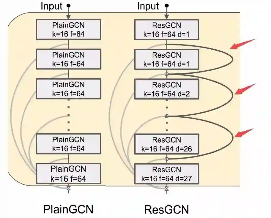 对于计算机视觉来说,图卷积网络对于场景中各部分的语义关系建模也十分有效,图卷积网络在对于点云的处理方面也涌现了一系列优秀的工作。例如在点云分割和提升深度的探索上研究人员们都进行了一系列探索,但研究发现较深的图卷积网络会引起过度平滑 (over-smoothing) 的结果,使得局域特征都收敛到相同的值上;此外随着网络的加深还会带来较高的计算复杂度和以及常见的梯度消失问题。