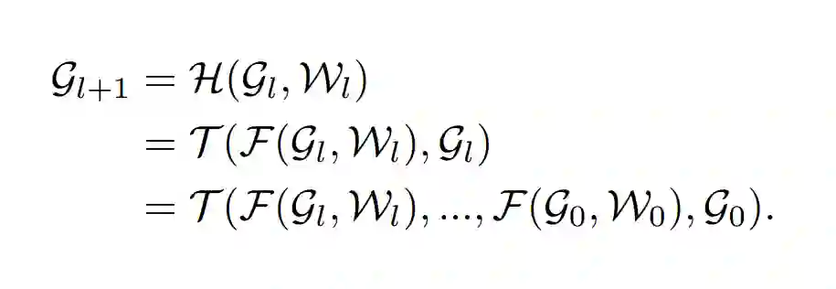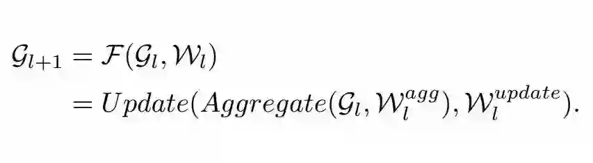 其中 Gl,Gl+1 代表了第 l 层图网络的输入和输出,图卷积操作 F 包含了聚合操作与更新操作,其中聚合操作用于从邻域的顶点中编码信息,而更新操作则用于将聚合后的信息进行非线性变化以计算出新的表达。