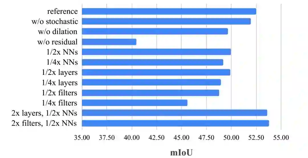 在上表中可以看到膨胀卷积所决定的感受野在性能上贡献了 3%,能更好地与残差链接协同工作。而当 k-NN 的邻域大小变为原来的 1/2 和 1/4 时,性能下降了 2.5% 和 3.3%,这意味着较大的感受野有利于模型性能的提升,但这一提升需要建立在模型有充分容量基础上。如果增加邻域的同时减小核的数量就会造成较大的性能损失。