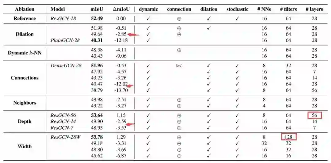 随后研究人员在 S3DIS 数据集上以 RecGCN28 作为基准,对网络的结构、参数进行了一系列改进。通过使用稠密连接、动态 k-NN 和不同的通道数与深度来分析模型的性能变化,下表总结了各种变体与基准模型的对比。