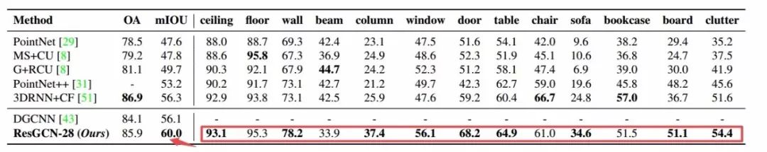 研究人员首先实现了 ResGCN28 作为深度图卷积的基础网络,其中包含了 28 层结构,包含了残差图连接和膨胀卷积。实验结果在 mIOU 上比目前的结果提升了 4%。