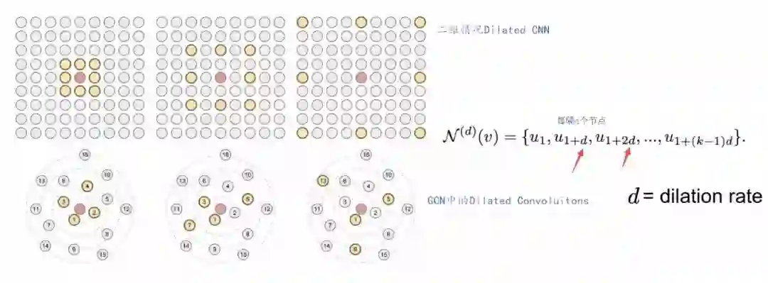 图像领域的研究表明,膨胀卷积 (Dilated Aggregation) 可以在不损失分辨率的情况下有效扩大模型感受野,研究人员通过 k-NN 的方式来寻找每一层 GCN 后需要膨胀的邻域,并构建了膨胀的图结构。例如针对一个膨胀率为 d 的图,k-NN 会在输入图中每隔 d 个相邻节点来构建 k*d 的计算区域并返回 k-NN 结果。