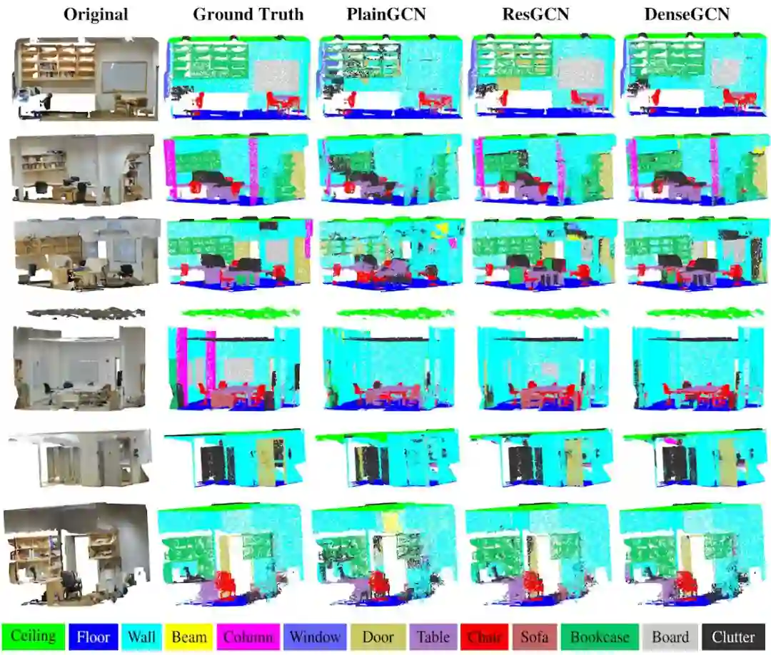 论文一作李国豪表示,「目前常见的图卷积神经网络一般都是 3、4 层,我们关注的问题是图卷积神经网络 GCN/GNN 是否也能和一般的卷积神经网络 CNN 一样加深到 50+层而不会有 Vanishing Gradient 问题,我们提出了 ResGCNs,DenseGCNs 和 Dilated GCN,MRGCN 等结构,甚至能训练收敛 152 层 GCN,并在点云分割任务上取得了比较好的效果。」