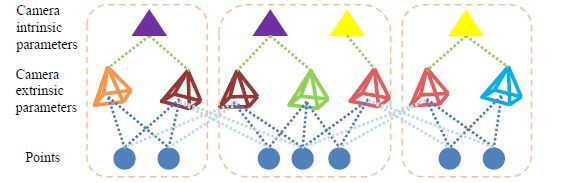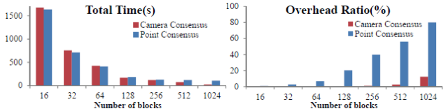 首先,作者基于全局相机一致性,从经典优化算法——交替方向乘子算法(Alternating Direction Method of Multipliers, ADMM)中推导得到分布式方法的计算公式。其次,作者分析了在这种条件下上述分布式优化方法的收敛性,并确保该方法能够收敛。此外,作者特别采用过松弛和自适应方案来提高其收敛速度。然后,为了减少分布式计算的通信开销,作者提出对大规模的相机点可视图进行分割的方案。