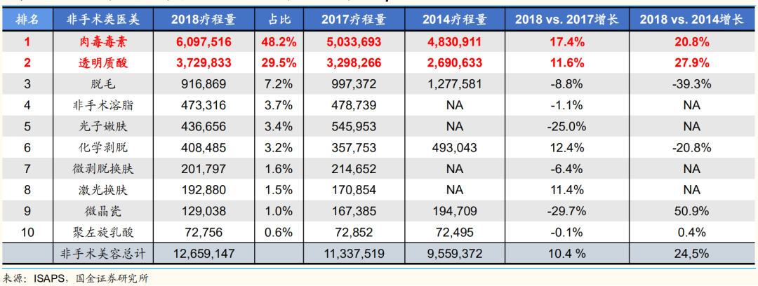 1992年,医美级肉毒素就已在诞生,此前肉毒素已被充分在医疗领域应用,可以被喻为最安全的医美针剂,2018年全球肉毒毒素诊疗量约为玻尿酸的1.6倍,其注射疗程数超600万次,位居第一占非手术医美项目总疗程数一半,而玻尿酸仅占30%。