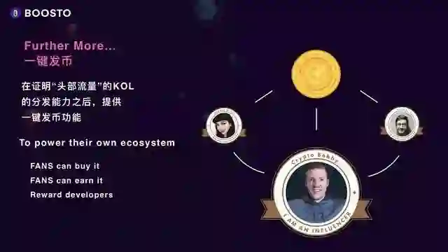 在证明“顶级流量”的KOL的分发能力之后,BOOSTO支持“一键发币”功能,开放给各大开发者为自己喜欢的KOL发币,流通到BOOSTO的整个生态体系里来。