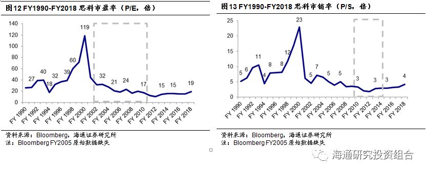 思科原传统硬件业务快速发展期(2001年前),其传统通信设备业务蓬勃发展至巅峰,可以多关注其P/E与P/B指标,并参考PEG法对其进行估值。业务进入平稳发展期(2001-2011年)后,订单充沛、利润稳定增加,P/E、EV/EBIDTA、P/S都有较强的适用性。而在通信设备商到IT服务商转型初期(2011-2015年),可以采用EV/S(或P/S)估值,且由于新业务初期增速较快,也可采用SOTP(分部估值法),对新业务采用PEG估值,对盈利稳定的传统业务采用P/E或EV/EBIDTA估值,多部加总得到公司估值。转型中后期(2015年后),思科转变为软件驱动的供应商,FCF重要性相对增强,可采用FCF方法对其进行估值。