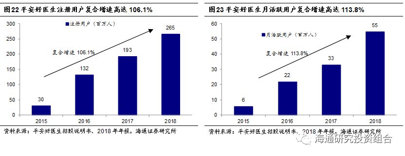 平安好医生以移动问诊核心流量入口,用户量增长迅猛。根据比达咨询数据,各类移动医疗应用日活跃用户中移动问诊类占比高达41.5%。平安好医生基于移动问诊业务优势,重点增加用户,用户增长迅猛,平安好医生注册用户从2015年的0.303亿户增长至2018年的2.65亿户,年复合增速高达106.1%,平安好医生月活跃用户从2015年560万户增长至2018年5470万户,复合增速高达113.8%。公司发展早期核心在于获取用户,这一时期公司比较合适用EV/MAU、EV/DAU来估值。