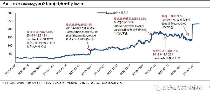 我们认为,创新药品种潜在投资收益最大的阶段是临床阶段,NDA以及获批上市则是“利好兑现”阶段。例如热门生物科技公司Loxo Oncology在2016年12月18日首次披露TRK抑制剂Larotrectinib的I期临床数据,显示优异的抗肿瘤活性,股价当天上涨25.83%。随后2017年6月3号,ASCO会议上Larotrectinib的II期临床数据惊艳亮相,股价再次大涨43.16%。反而到2018年5月29日和2018年11月26日,FDA接受Larotrectinib的NDA申请和获批上市,当天股价均出现下跌。