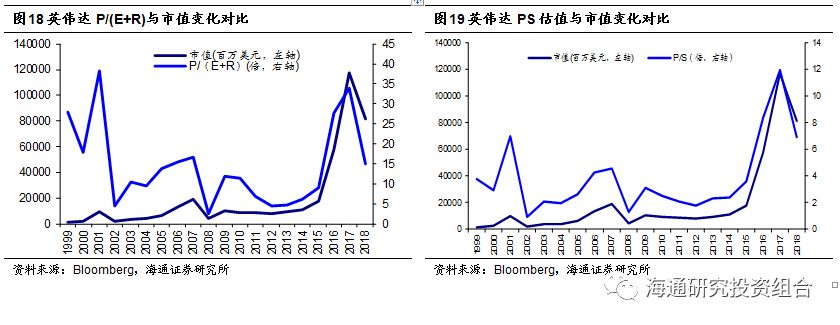 估值方法:IC设计公司将产品制造以及封测环节外包,故公司固定资产以及运营费用较低,但在发展初期以及成长阶段需要保持巨额的研发费用投入。在公司将研发投入转化为收入前,由于研发费用支出较大,公司盈利能力相对较弱,因此可以用PS估值法来反映公司营收先于盈利释放的情况。2014年之前,英伟达的P/S估值系数相对稳定(剔除2000年互联网泡沫阶段)。同时也可以使用P/(E+R)来反映公司的研发投入对未来成长性带来的贡献。