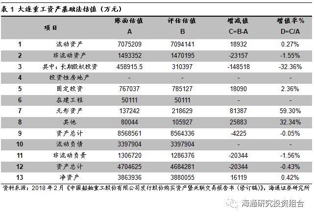 案例分析:中国重工发行股份收购资产。中国重工是我国大型海工及船舰制造企业。2018年2月,公司公告拟通过发行股份的方式收购少数股东持有的大连重工、武船重工股权。根据2018年2月公布的《中国船舶重工股份有限公司发行股份购买资产暨关联交易报告书(修订稿)》,中国重工对大连重工和武船重工的收购都是通过基础法进行定价评估。通过资产基础法,大连重工的资产价值为388亿元,增值率为0.42%,以下为该方案定价过程。